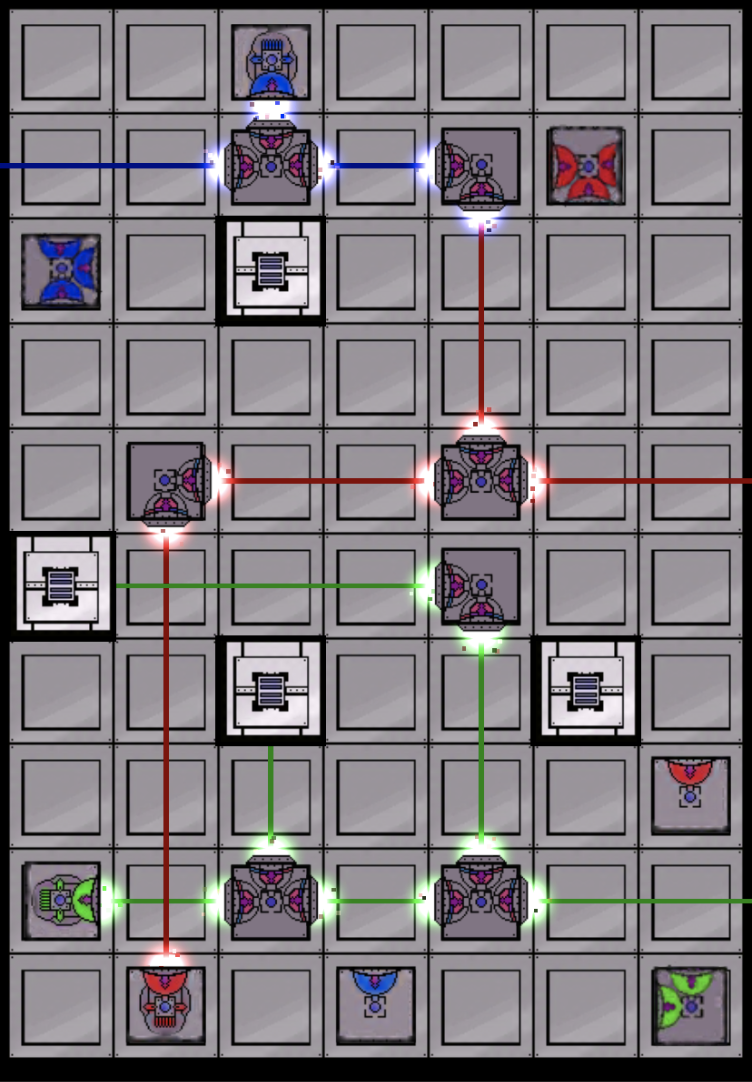 Mechanics : We implemented some new functionality to obstacles and laser sources, allowing them to be activated or deactivated when certain targets are turned on by lasers. No sprites yet, but expect some fun multi-layered puzzles coming soon 🙂 Laser Beams : The lasers actual have some character now! What once were stationery lines are now laser beams that fluctuate in width and color to an extent. This can’t really be shown through pictures but trust me, its cool. Particle Systems : These upgrades are by far my favorite. Laser beams should feel alive and powerful, and these particle systems help reinforce that. Ports have cool particle systems attached to them which are turned on or off based on lasers.